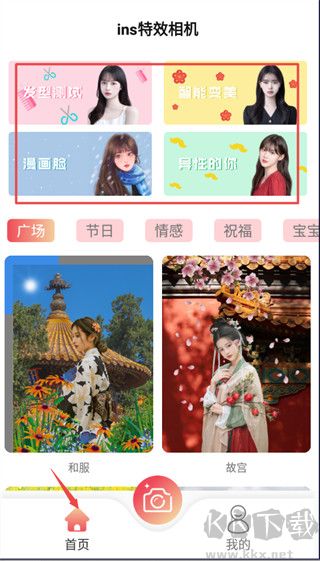 1、打開軟件,在首頁有“發(fā)型測試”,“智能變美”,“漫畫臉”等功能;