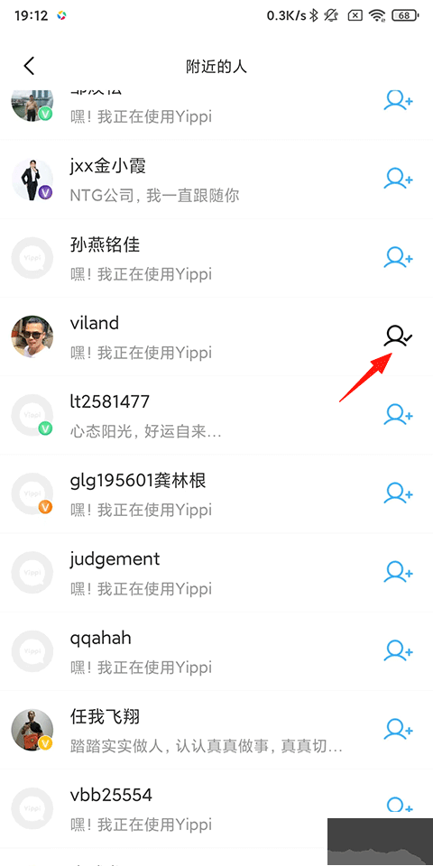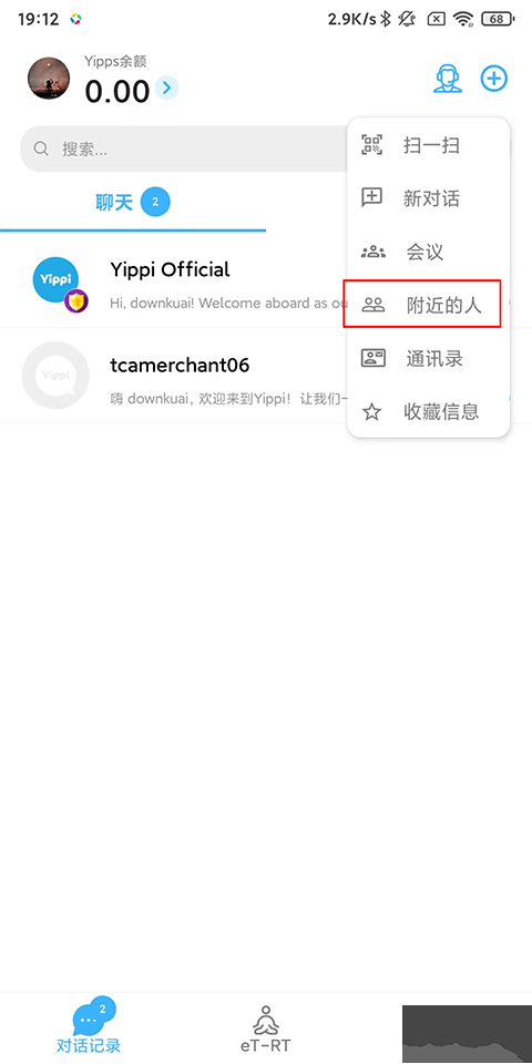 1、打開Yippi聊天軟件,點擊右上角的+按鈕,在彈出的列表中選擇附近的人;