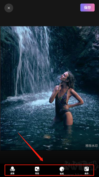 3、在這里可以選擇濾鏡、特效、貼紙和畫布進行圖片調整,