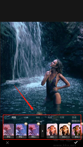 4、例如在特效中有閃光、vcr、90s和海報等各種濾鏡,你可以選擇自己喜歡的特效來修改圖片,