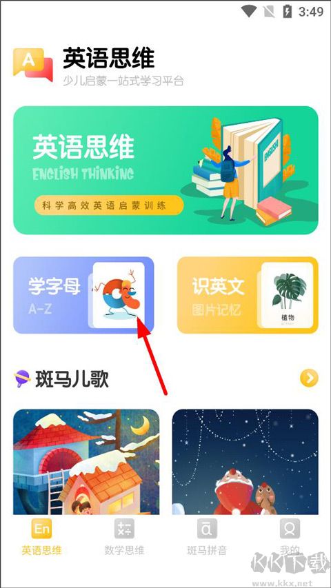 1、點開嘟嘟數(shù)學(xué) app,登錄后進(jìn)入英語思維主頁,可在此頁面認(rèn)識字母、熟悉英文、學(xué)唱兒歌等,點擊認(rèn)識字母。