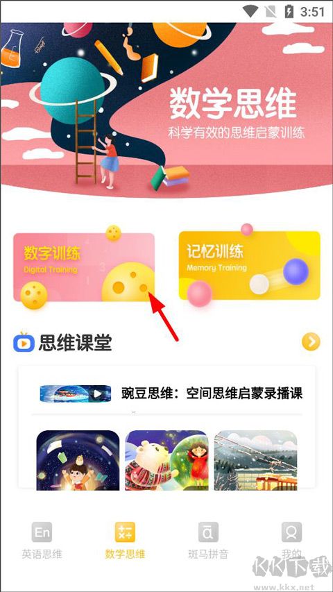 3、點開數(shù)學(xué)思維頁面,可開展數(shù)字練習(xí)、記憶練習(xí)以及思維課程,點擊數(shù)字練習(xí)。