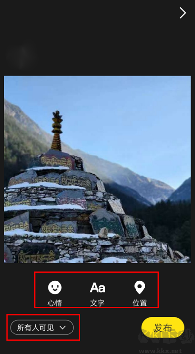 發(fā)布步驟:拍攝照片或從相冊挑選照片 -> 在照片上標(biāo)注心情、文字、地理位置,選擇可見人群 -> 發(fā)布日記。