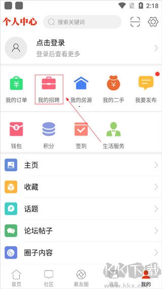 1、進入綦江在線 APP 的個人中心頁面,點擊 “我的招聘”。