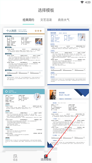 2、填好信息后,切換到選擇模版頁(yè)面,選擇喜歡的模板,點(diǎn)擊即可。找到簡(jiǎn)歷閱覽中的分享/下載按鈕,即可分享、下載、保存到相冊(cè)。