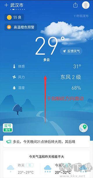 1、打開(kāi)彩云天氣的主界面,手指從下往上滑動(dòng),拉到下方的詳情內(nèi)容。