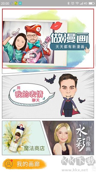 1、在主頁面上,我們可以看到它有4大板塊,分別是做漫畫,用我的表情聊天,水彩肖像畫和魔法商店,以及做好以后的作品我的畫廊。今天我們要將的是漫畫制作,因此其他的幾項(xiàng)我們不用管,用手指觸一下便可進(jìn)去了。