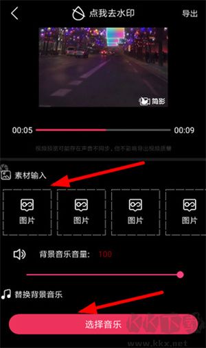 2、接下來需要滑動到下方使用“素材輸入”功能,添加手機本地相冊的圖片素材,甚至是替換背景音樂。