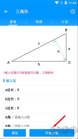 4、此處以三角形計(jì)算為例,輸入相應(yīng)的參數(shù)后,點(diǎn)擊開始計(jì)算軟件就會(huì)自動(dòng)為你計(jì)算了。