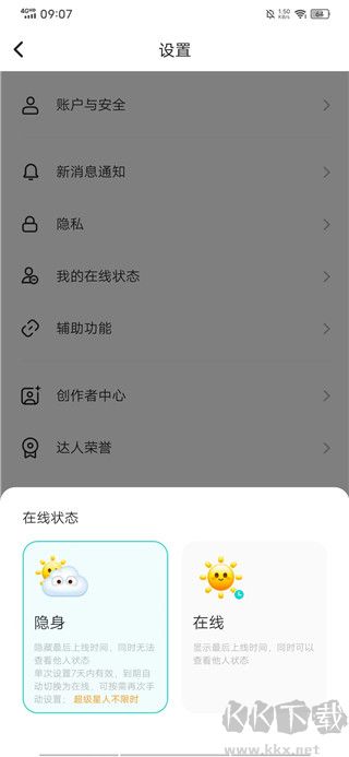 4、在下方彈出的頁面中選擇【隱身】即可完成設(shè)置。