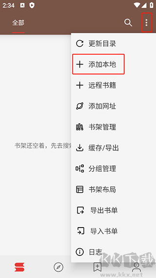 1、書(shū)架界面最右上角三個(gè)點(diǎn) ? 圖標(biāo),然后點(diǎn)擊添加本地。