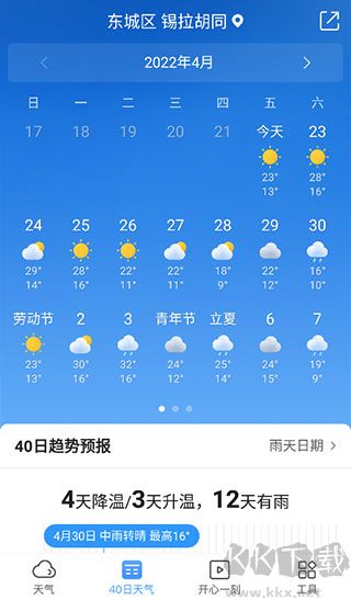 3、在40日天氣頁面,可以查看未來40日的天氣預(yù)報,還會自動統(tǒng)計升降溫天數(shù)和下雨天數(shù),讓你一目了然。
