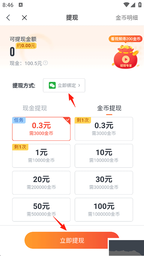 2、先綁定微信號,完成后選擇金幣/現(xiàn)金提現(xiàn),提現(xiàn)金額等,最后點擊立即提現(xiàn)。