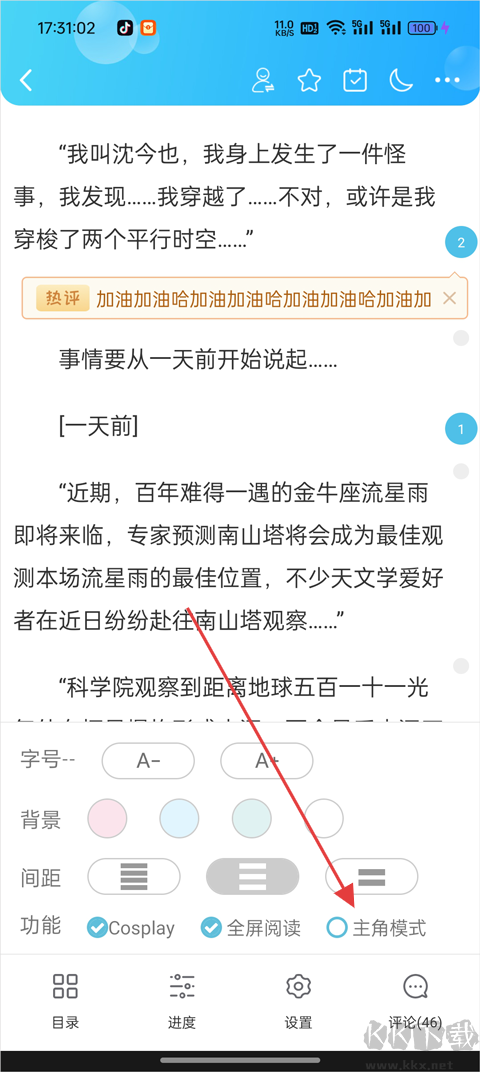 4、選擇【主角模式】開啟個(gè)性化閱讀體驗(yàn);