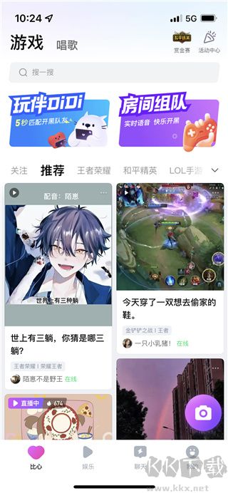 1、打開比心APP,在比心首頁可點擊玩伴DIDI,5秒匹配開黑隊友,還有房間組隊,實時語音,快樂開黑;