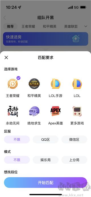4、通過“快速進房”功能,選擇游戲、區(qū)服、模式、段位,不需要等待,秒速匹配。