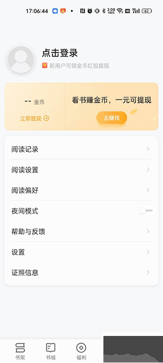 1、下載小說軟件,點(diǎn)擊進(jìn)入首頁,再點(diǎn)擊我的,可以看到上方顯示閱讀小說即可賺錢,且滿一元就可以提現(xiàn);