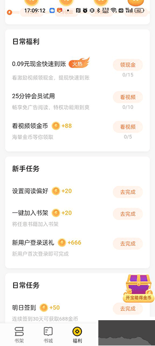 2、點(diǎn)擊中間下方的福利按鈕,即可每日簽到領(lǐng)取金幣,金幣可以兌換成零錢提現(xiàn);