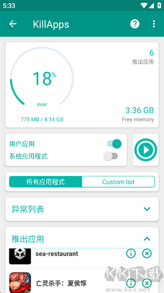 killappsapp是一款手機運行內存優(yōu)化軟件??梢钥焖訇P閉所有正在運行的軟件,幫助提升手機運行速度、改善手機性能。它的原理是結束手機里不必要的后臺軟件和進程,可以延長電池壽命、增加手機使用時長,還能幫助游戲加速、提升游戲性能,從根本上解決手機卡頓變慢的問題。需要的朋友快來下載試試吧!