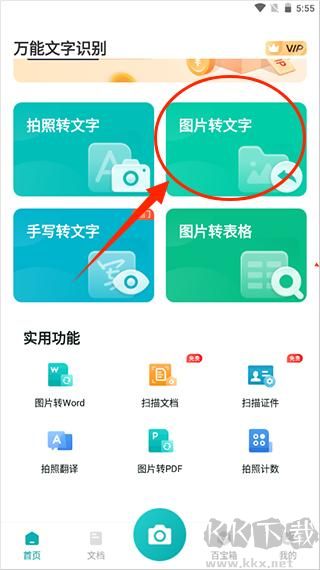 1、下載并打開(kāi)萬(wàn)能文字識(shí)別,在主界面點(diǎn)擊“圖片轉(zhuǎn)文字”選項(xiàng)。