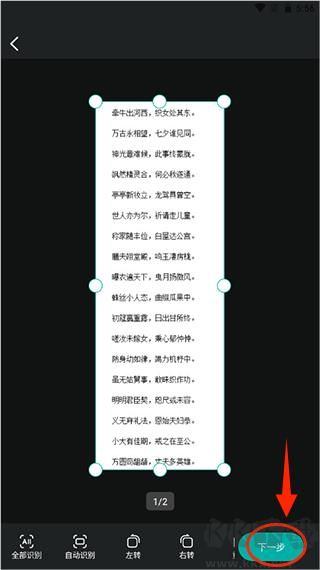 3、在圖片編輯界面選擇識(shí)別的范圍,可以全部識(shí)別或自動(dòng)識(shí)別,點(diǎn)擊下一步識(shí)別即可。
