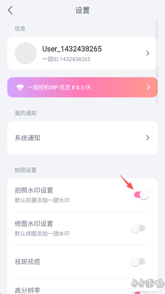 2、在點擊“拍照水印設(shè)置”右側(cè)的“開關(guān)鍵”。
