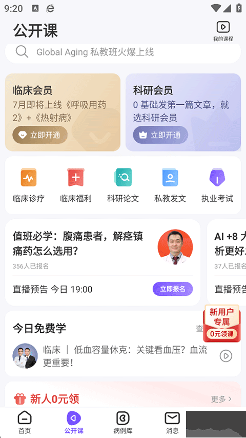 2、在公開課頁面包含了眾多如臨床診療、科研論文、執(zhí)業(yè)考試等課程學(xué)習(xí)資源;