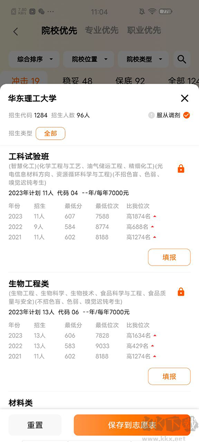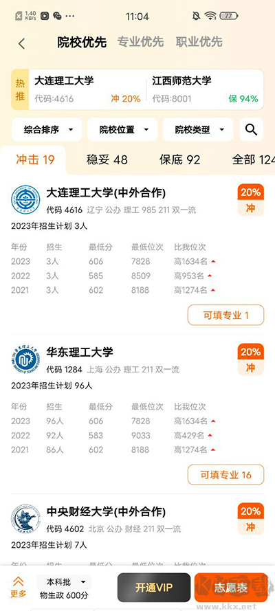 3、軟件會(huì)幫你將可以報(bào)名的學(xué)校列舉出來,并將其分為:可沖擊、較穩(wěn)妥、可保底三大類。