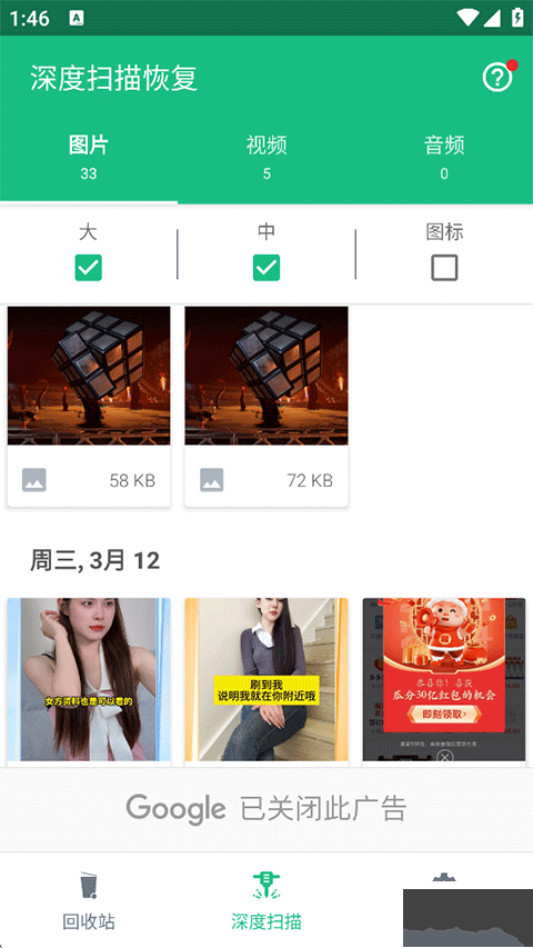 1、打開Dumpster回收站后會(huì)自動(dòng)開始對(duì)手機(jī)進(jìn)行深度掃描,掃描完成之后,圖片、視頻、音頻,都能先預(yù)覽一遍,再?zèng)Q定是否恢復(fù)。