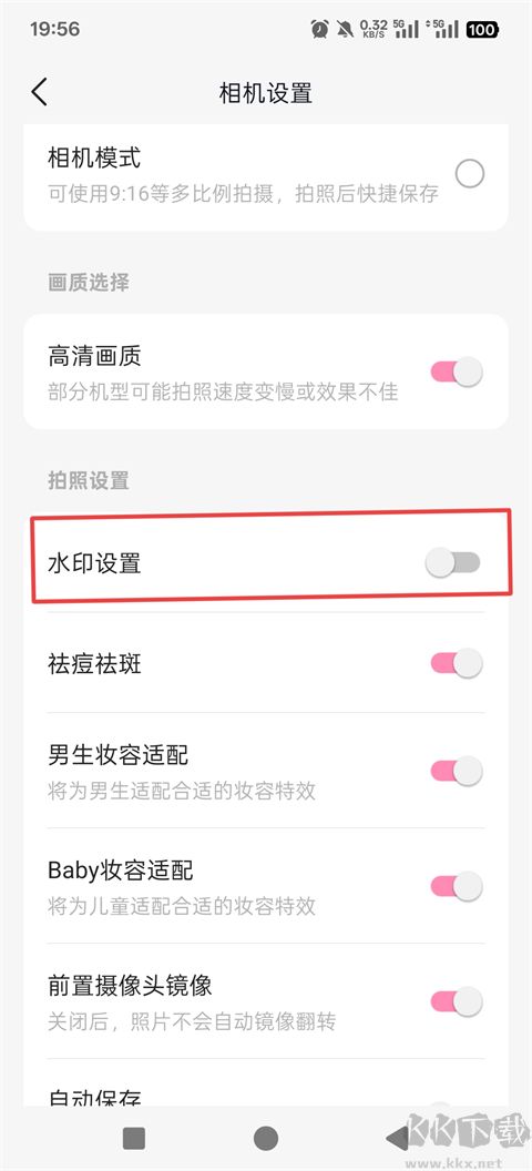 3、找到水印設(shè)置,關(guān)閉即可。祛痘祛斑、男生妝容適配等功能都是在這里關(guān)閉的。