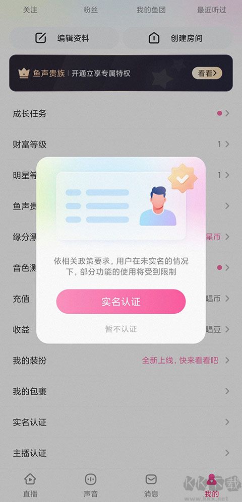 1、在魚聲app開通直播需要先進(jìn)行【實(shí)名認(rèn)證】。