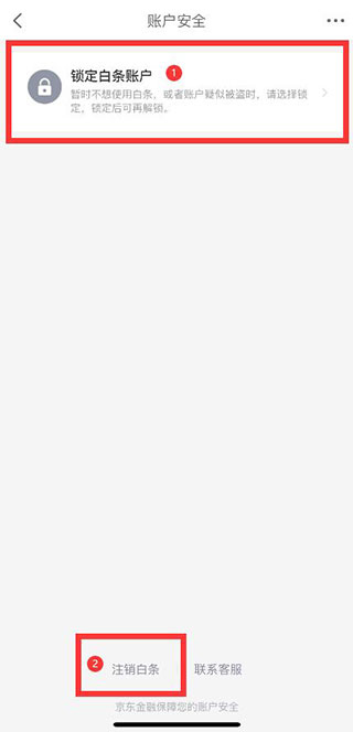 4、這一步很重要!頂部大大的是鎖定白條賬戶,不是注銷!請點擊底部位置的【注銷白條】按鈕。