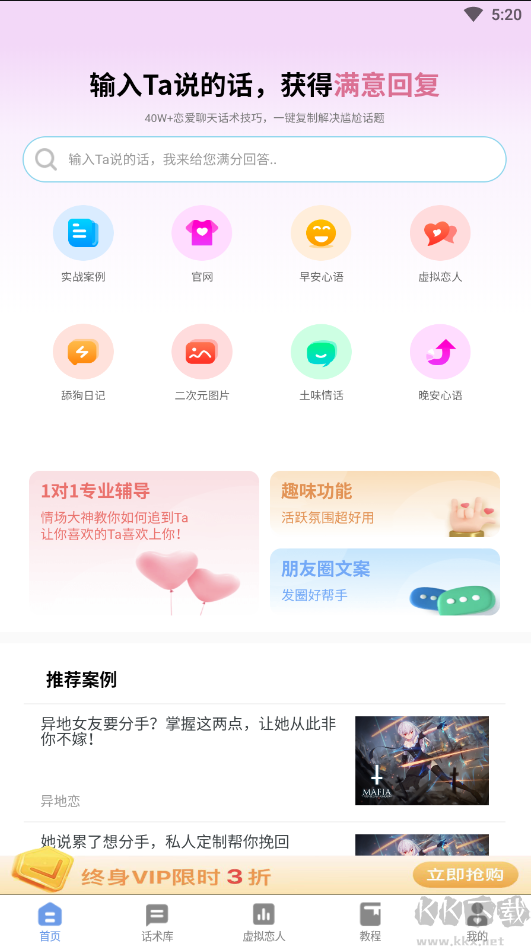 戀愛寶典是一款戀愛話術寶典大全一款教你如何與女生聊天,提高情商的手機應用。這款軟件內(nèi)涵擁有30w+的聊天話術、戀愛話術、聊妹話術、情感話術、戀愛術語、高情商聊天術完美解決了遇到不知道怎么回復女生時的尷尬。還有10w+的土味情話,戀愛物語,聊天表情包,情侶頭像,朋友圈勵志語錄等等戀愛輔助器為你的愛情助力!戀愛話術寶典是指通過一系列的技巧和方法,來改善個人與戀人之間的溝通和交流能力。戀愛話術寶典包括如何創(chuàng)造良好的氛圍、如何用言語表達情感、如何有效地解決問題、如何保持穩(wěn)定的關系等。通過學習這些話術,可以提高戀愛成功率,建立更加健康穩(wěn)定的戀愛關系。這款應用是交友,戀愛,約會,聊天中不可少的一款聊天神器app,聊天小助手。