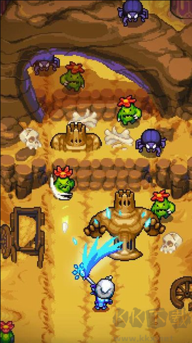 3、長按為蓄力攻擊,會發(fā)射一條弧線技能,下方一列為技能道具欄,解鎖的技能,各種藥劑補給都在這里。