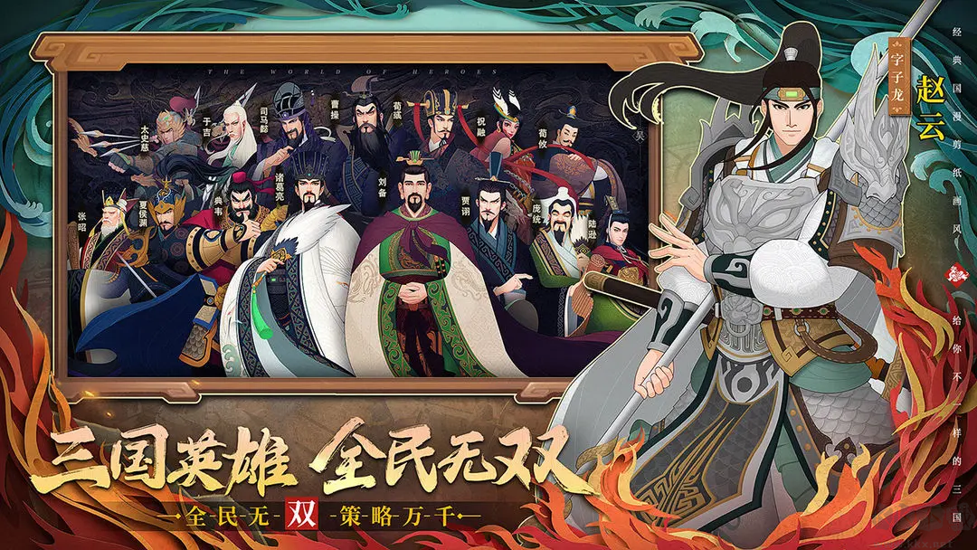 致敬“上美影”風(fēng),將中國本土的宏大敘事國漫剪紙格融入經(jīng)典三國英雄形象,通過簡潔扁平的國漫風(fēng)與傳統(tǒng)的白描繪制塑造鮮活三國角色。在大地圖的呈現(xiàn)上,結(jié)合游戲玩法給玩家?guī)礤\繡山河的沉浸寫意感。