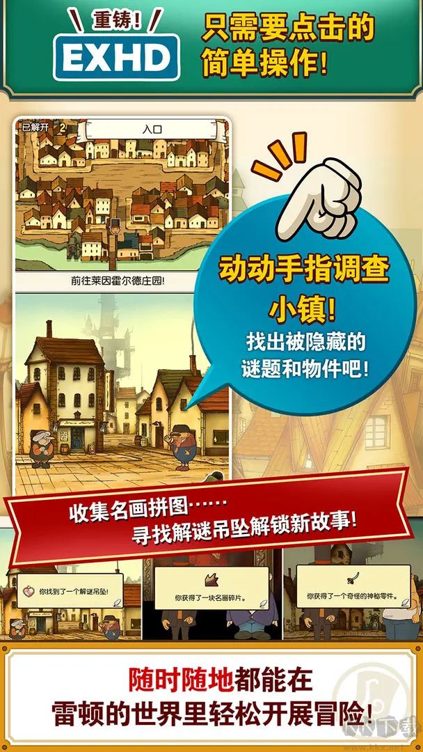 雷頓教授與不可思議的小鎮(zhèn)是一款冒險解密游戲,游戲玩法有趣,藝術(shù)風(fēng)格獨特,劇情體驗極佳。游戲由劇情和解密兩部分組成。劇情方面,玩家需要根據(jù)指示,通過點擊來與一個個場景里的可互動元素互動來進(jìn)行移動、對話等。玩家可以在劇情節(jié)點間探索已開放的場景,并與場景元素互動來游玩一個個小迷題。整個操作只需要下屏的觸控。