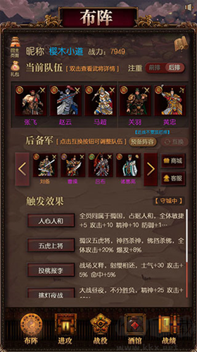 進攻周邊城池(盟友城池除外),合理搭配出征武將是關(guān)鍵,很多武將都有組合效果提升屬性或效果,可以大大提升戰(zhàn)斗效果。