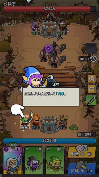 1、在游戲中,點(diǎn)擊下方的角色即可進(jìn)行上陣,選擇一個(gè)后其余的兩個(gè)角色就會(huì)消失。每個(gè)職業(yè)內(nèi)部也會(huì)有不同能力的英雄,用金色,紫色,藍(lán)色,綠色,不同的顏色來(lái)代表不同英雄的強(qiáng)度。