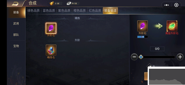各種裝備、武將殘魂、技能殘卷、士兵升階材料、寶石及寶物都可以在這里合成為更加高級的資源,需要消耗銀兩。
