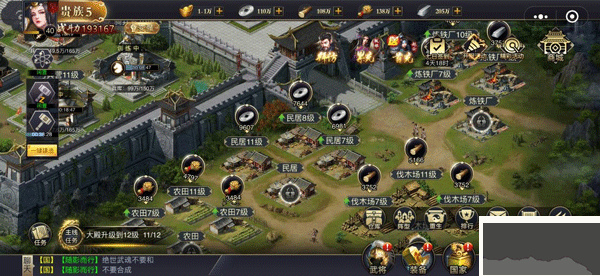 右邊則是資源生產(chǎn)區(qū),即民居、農(nóng)田、伐木場、煉鐵廠,分別生產(chǎn)銀兩、糧食、木材、鐵礦。