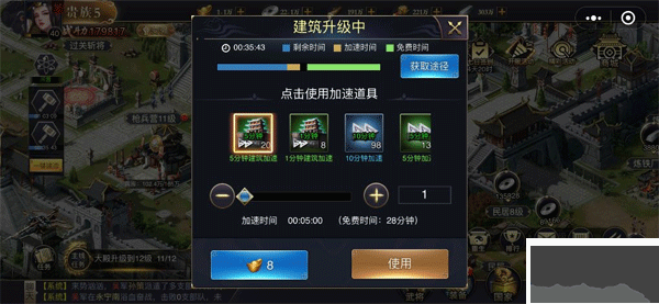 最左邊的是建筑升級位,只有兩個位置,來給你主城內(nèi)各種建筑物升級用。升級時間可以加速。消耗品也和大殿一樣,所以后面要很注意這些資源的獲取哦。這個升級位盡量不要讓他閑置著,因為后面你需要的建筑物等級只會越來越高,所以只要有足夠的消耗資源,有閑置位置就把等級升了。