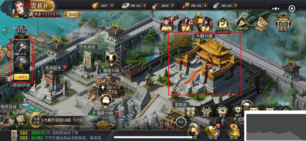 最上方的大殿是主建筑,升級了大殿你才能解鎖更多建筑和功能,解除更多禁止。大殿需要君主等級、現(xiàn)有建筑物等級、爵位等級等達到一定條件時才可以升級,需要消耗銀兩、糧食、木材、鐵礦(可通過主城建筑生產(chǎn)、城市資源采集獲得)。