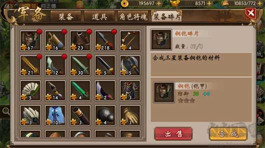 裝備碎片界面可以對已經(jīng)收集到的裝備碎片進(jìn)行“合成”、“出售”操作
