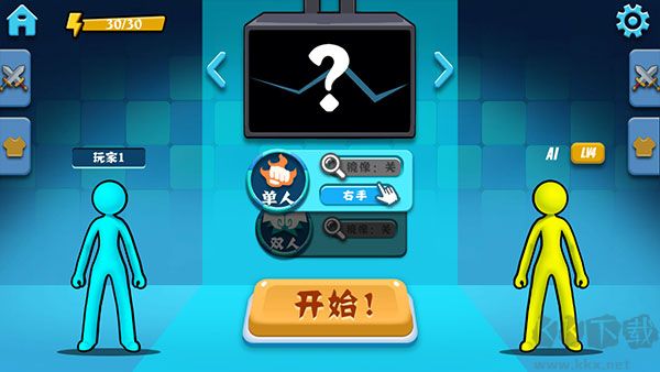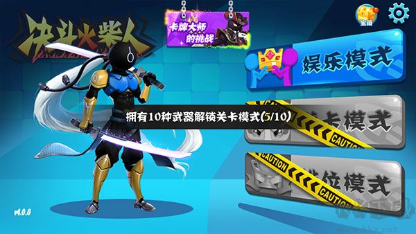 2、點(diǎn)擊進(jìn)入娛樂模式。在此模式下,可依據(jù)自身偏好選擇單人闖關(guān)或雙人闖關(guān),同時(shí)還能對(duì)火柴人的武器與服裝進(jìn)行選擇 。