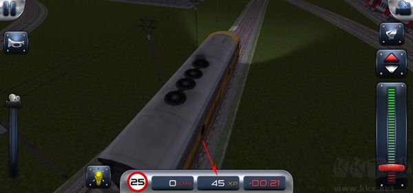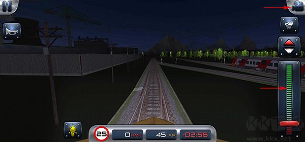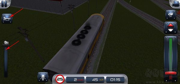 7、右側(cè)自上至下的按鈕依次為切換火車視角按鈕、鈴鐺按鈕、前后檔位按鈕以及用于控制火車行駛的檔把;
