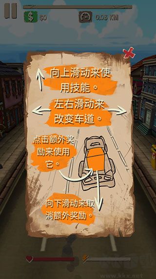 3、掌握操控方式:進(jìn)入場(chǎng)景,通過(guò)左右滑動(dòng)變換車道,上滑操作使用技能。