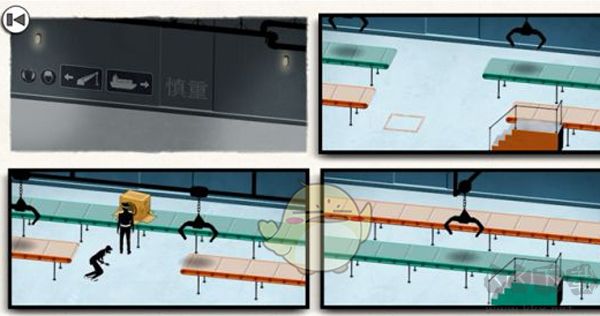 這是最難的一章。需借助紙箱,利用傳送帶過關(guān)。要多次調(diào)整畫面,關(guān)鍵是讓箱子上紅色傳送帶,人物上綠色傳送帶,使箱子在畫面五落下,人物從警察背后綠色傳送帶出現(xiàn) 。