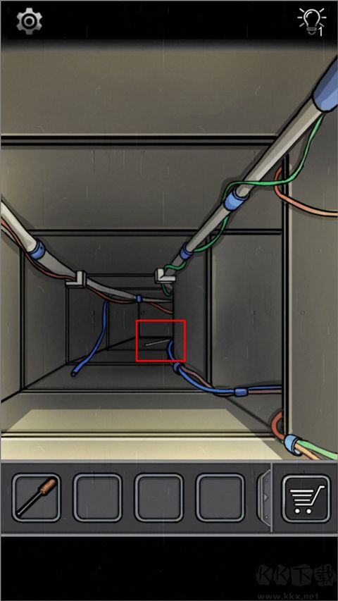 直行得到一根鐵棍,右行看到轉(zhuǎn)動的風扇,將鐵棍放入風扇,螺絲刀擰螺絲,打開。
