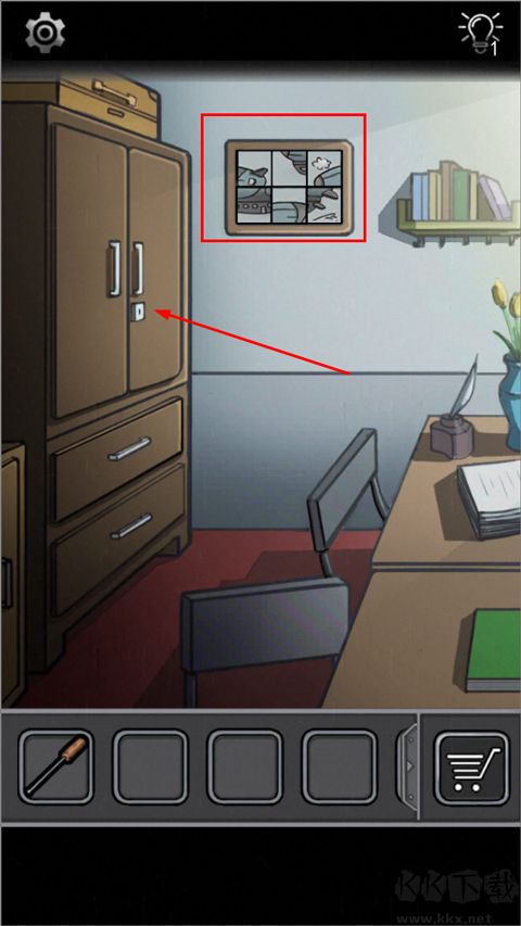 墻上拼圖拼好得鑰匙,打開櫥子,拿出對應(yīng)東西,換裝。