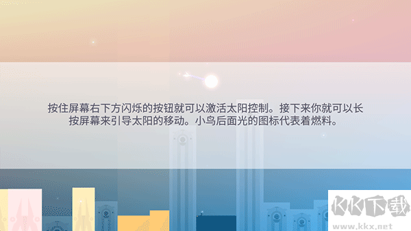 7、按住屏幕右下方閃爍按鈕激活太陽(yáng)控制,長(zhǎng)按引導(dǎo)移動(dòng),小鳥(niǎo)后光標(biāo)為燃料。